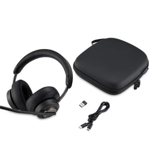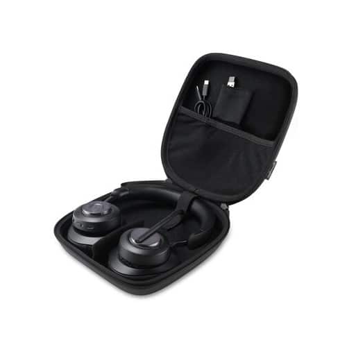 • Built to accommodate busy professionals, the H3000 allows you to roam up to 30m* from the desk—and includes one USB-C with USB-A adapter, a USB-C charging cable, and a premium hard case to protect your headset when traveling. *Your connected device must be within your line of sight. Wireless range may vary based on users and computing conditions.